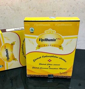 Obat herbal fitofarmaka yang satu ini merupakan produksi Royal Medicalink Pharmalab. VipAlbumin Plus merupakan suplemen makanan untuk meningkatkan kadar albumin dan hemoglobin. VipAlbumin merupakan ekstrak dari ikan gabus. VipAlbumin bagus untuk anak-anak, ibu hamil, hingga lansia.