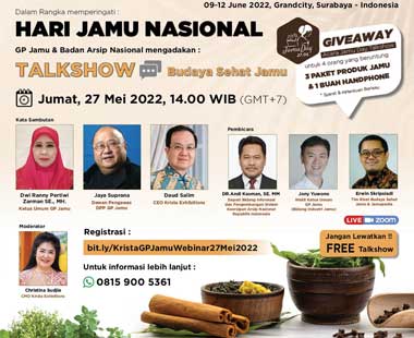 Menyongsong Kebangkitan Jamu Indonesia Talkshow Hari Jamu Nasional Eksistensi jamu harus terus dilestarikan. Kebaikan jamu harus terus disebarluaskan. Minuman kesehatan ...[More]
